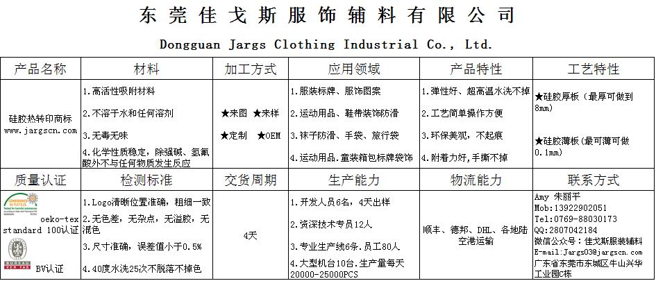 东莞市佳戈斯服饰实业有限公司是硅胶热转印3D标牌、硅胶标牌、硅胶烫画、硅胶丝印薄版厚板、硅胶烫压标牌、内衣滴硅胶涂层、织带滴硅涂层、手套、手袋印花、矽利康标牌、箱包标牌等产品专业生产加工的公司,拥有完整、科学的质量管理体系。东莞市佳戈斯服饰实业有限公司的诚信、实力和产品质量获得业界的认可。欢迎各界朋友莅临参观、指导和业务洽谈。