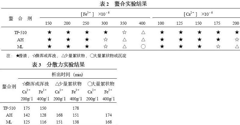 1.2 螯合分散力实验 称取0105g 螯合分散剂于盛有42ml 蒸馏水的50ml 具塞量筒中, 分别加入FeCl3 溶液( [ Fe3 + ]为100 ×10 - 6~600 ×10 - 6 ) 和CaCl2 溶液( [Ca2 + ]为100 ×10 - 6 ~400 ×10 - 6 ) , 再各加入5ml 20 %的Na2CO3 溶液, 加蒸馏水至50ml , 振摇均匀, 室温下置3h 后观察、记录并过滤, 结果见表2。从实验看出: 1) 螯合分散剂对Ca2 + 、Fe3 + 的螯合力TF2510 > AH > ML ; 2) 絮状物或沉淀析出速度TF2510 最慢, AH 与ML 接近。说明分散性TF2510 最好, AH 与ML 接近。