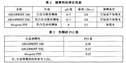大部分合成增稠剂的PVI值为0.22~0.23。从表1中的数据可以看出.合成增稠剂160的PVI值接近这个值.而THC的PVI值偏大.但它们都适用于机印、平网印花和圆网印花。