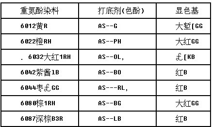 快色素染料就是利用显色基的反式重氮化合物不会与打底剂偶合的性能,将它们混在一起,然后又利用反式重氮化合物,在酸的作用下又能转化成能与打底剂偶合的活泼重氮化合物的性质而使染料发色。 显色基并不是都能做成重氮色酚的染料,一般选用带有负性基的显色基来制取反式重氮盐,因它比较稳定,且能溶于水。由于带负性基的色基仅限于黄、橙、红及枣红等色泽,因此色谱范围不广。常用的快色素染料见表6—15。