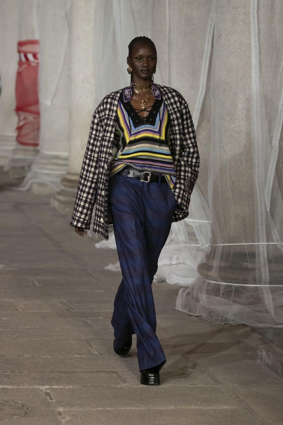 ETRO 2023秋冬系列延续品牌经典的面料和复古印花,以流畅剪裁和韵律感十足的印花组合。所有的元素都自然而然地融合在一起,飘逸的长裙配上版型宽松的厚针织衫,中性长裤和背心混搭丝质衬衫。整个系列以修长、精准的剪裁搭配华丽的面料和匠心工艺。