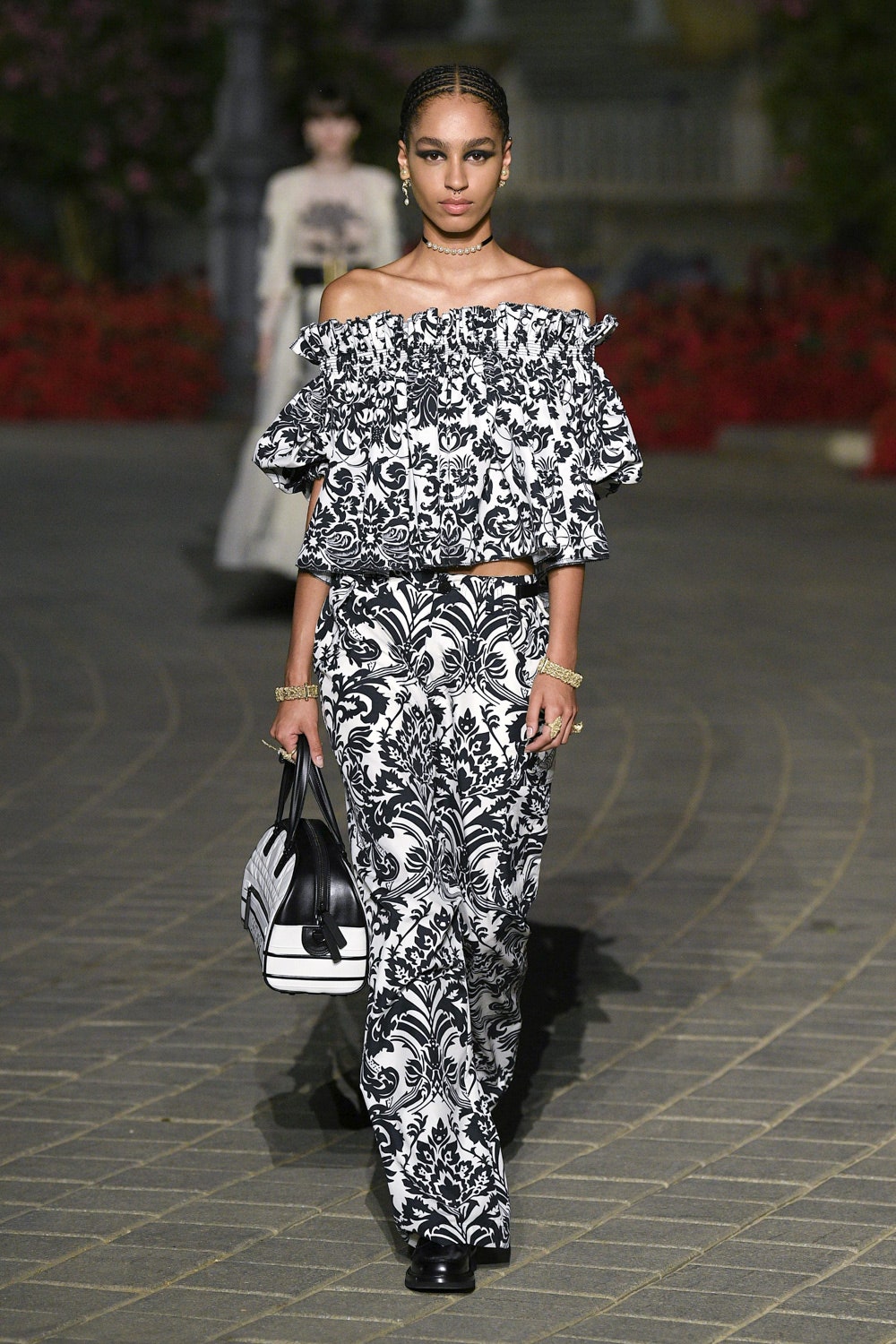 迪奥女装创意总监MARIA GRAZIA CHIURI将品牌秀场搬到塞维利亚西班牙广场,以西班牙艺术家、弗拉门戈舞者卡门·阿玛亚为灵感缪斯,将背带裤、短夹克、斗篷、骑士裤装等充满游牧风情的单品,与洋溢着热情与活力的红色、黄色、赭石色与黑色塔夫绸半身裙融为整体,充满别样的西班牙式浪漫。