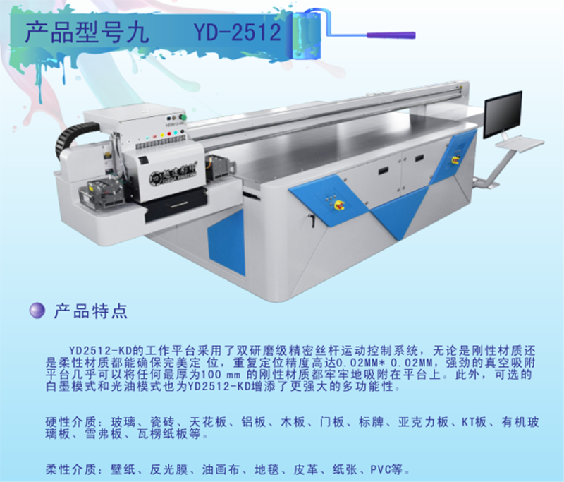 15、克服材料的界限:可彩印规定厚度内的任意介质,完全克服了只能使用专用纸张和专用规格的传统彩印方式,可以使用非常薄或非常厚的物件,其厚度可达到200mm/100mm。