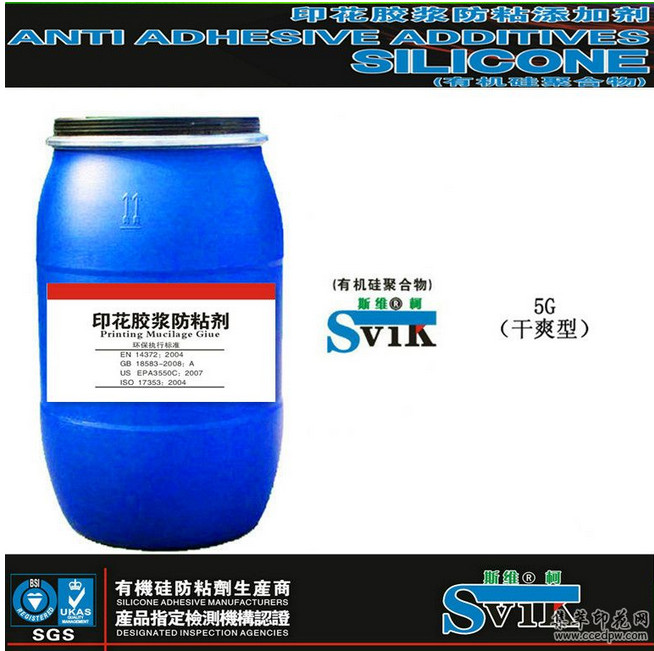 印花胶浆防粘剂采用新型的乳化技术生产的技术含量高的产品, 其水溶性强、乳液稳定,表面无结孔,底无沉淀.印花胶浆防粘剂可任意比例水稀释不分层、不破乳。SviK-5G印花胶浆防粘剂应用于水性印花胶浆中,可起到干爽、防水、增滑、耐磨、抗粘的作用效果。