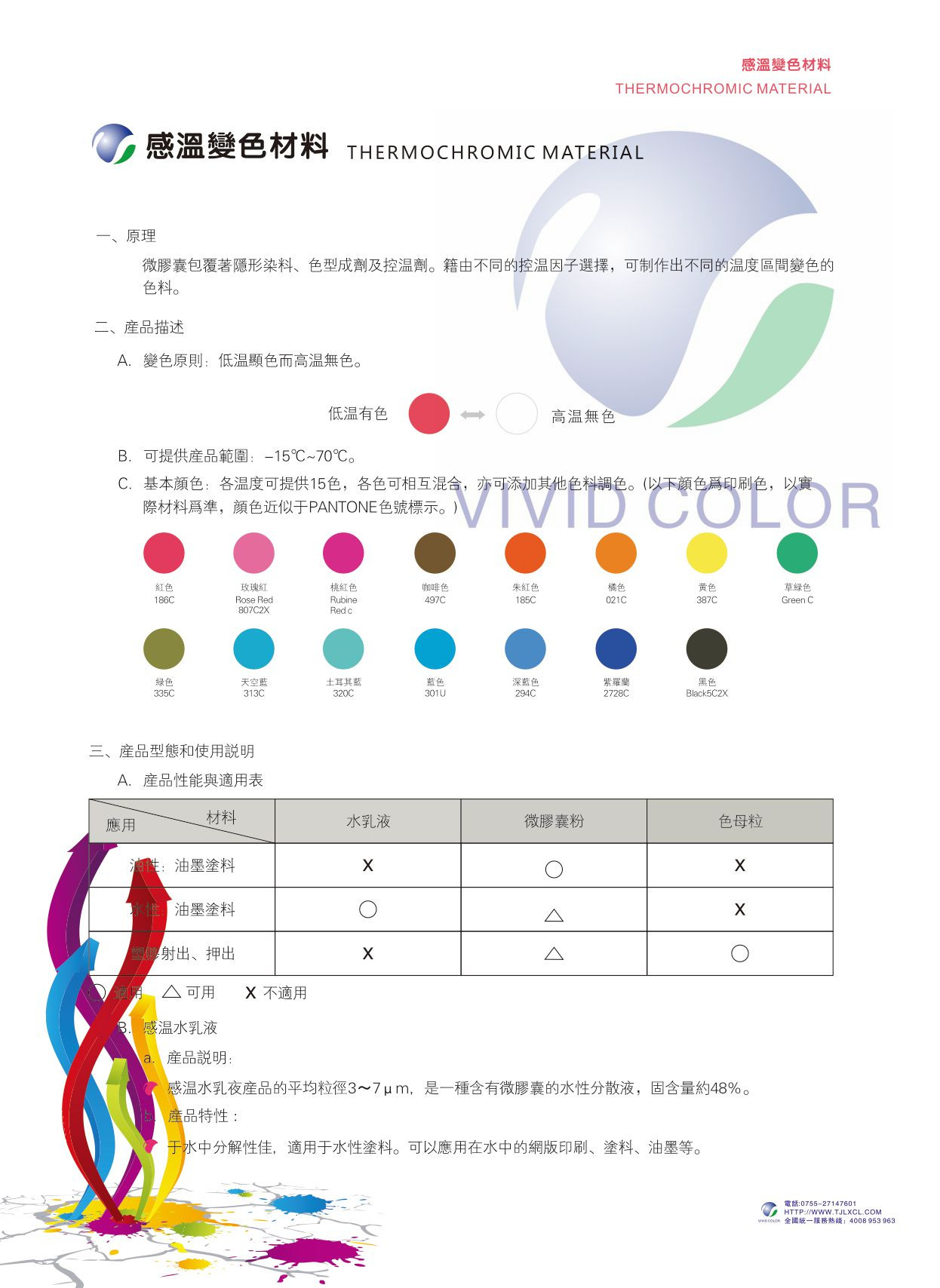 可变化温度区间为-15℃到71℃,可因各种产品应用之不同需求,而设定不同的温变临界温度,一般变色温度设定间隔2℃到10℃,色度从低温到高逐渐递减,直到接近透明。常用的温度有: 适合冷飼食品使用的8℃、15℃。适合人体接触使用有31℃、33℃、38℃,适合热饮食品标示使用的45℃、65℃等。