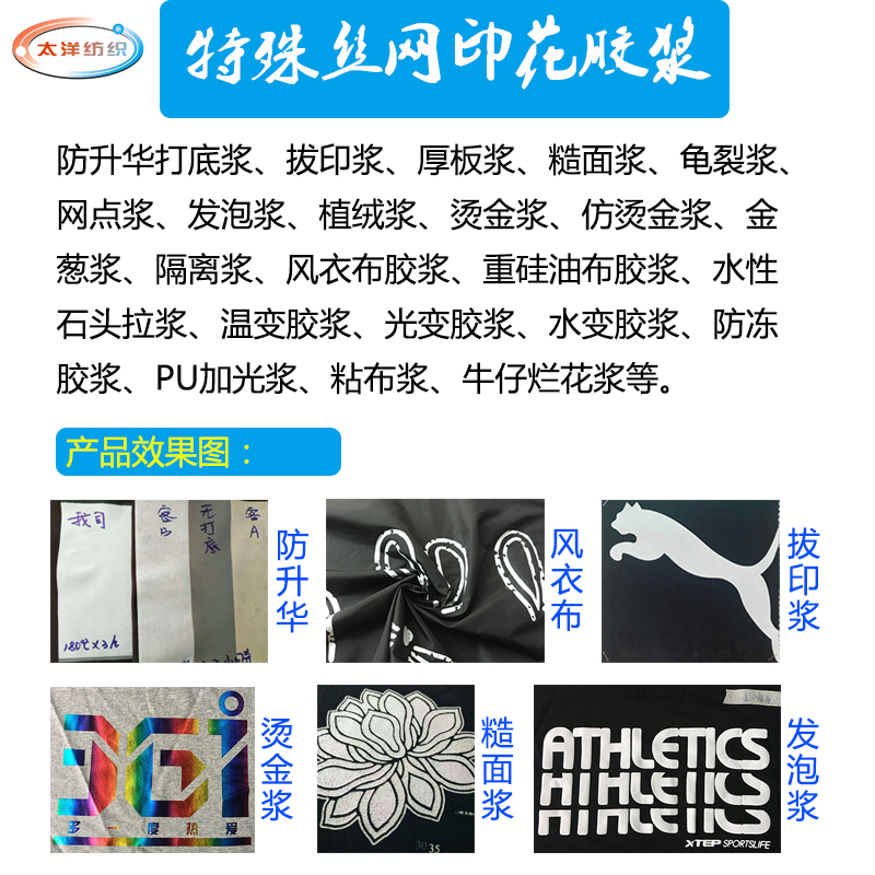 东莞市太洋纺织用品有限公司是一家专业从事于服装丝网印花胶浆、固浆、印花粘合剂、印花树脂等水性环保印花材料的研发、生产厂家。产品广泛用于服装、箱包、鞋材等丝网印花工艺中,具有高弹柔软、耐水洗、高遮盖、高牢度、不塞网、不反粘、干湿擦在3.5级以上,水性环保等特点,欢迎广大新老客户朋友前来咨询取样!(134-1277-1959 微信:MQL5858 莫S)