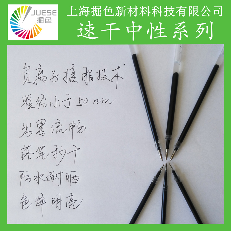 由掘色科技自主研发的颜料型速干中性墨水,经多年努力研发,终于突破技术瓶颈,采用国际领先的负离子接枝技术,使颜料粒径在小于50nm时依旧稳定、无凝聚。出墨流更畅,干燥更迅速,行业内的速干要求在十秒之内,而由掘色科技自主研发的颜料型中性墨水只需两秒,堪称秒干。