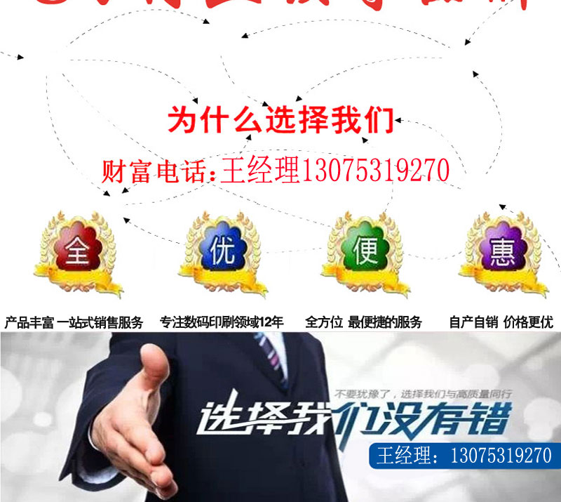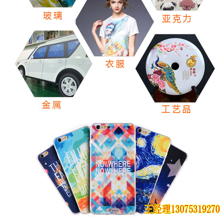 可以在任何平整的软、硬性材料表面,称:万能机。实现高精度多色、无版非接触、即喷即干的环保喷印过程,设备占地小,可单人操作,生产过程简单、交付快捷、适合装饰、广告、包装领域多种材料的修改化印刷业务。 对承印材料不需印前和印后的专门处理,节省了大量人力、物力。 实现了真正的无版印刷,单张与批量加工的成本一致,可以经济高效地完成中短版活件,增加更多的商业机会。 补充了传统网印工艺的不足,不仅用于小印量的需求,还可用于打样或模拟图像效果,使您的客户能从多种工艺中选择最适合的加工技术。 设计、生产过程简单,可单人操作,满足客户立等可取的交付需求。