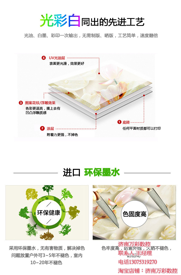 山东济南万彩数控设备有限公司是一家集uv平板打印机/广告标牌uv打印机研发设计、生产、销售于一体的专业公司,我公司生产的机器可以直接在任何平面材料(比如:广告标牌、金属、定制酒瓶、瓷砖,玻璃,亚克力,木板,PVC,工艺品礼品、酒盒、酒瓶、包装盒、铁书立、铁皮柜,皮革、塑料、工艺品等等。)上印出你想要的3D效果图,无需制版、不用出菲林、无需套色、一步成型,只需连接一台电脑即可完成操作,是目前先进的设备。